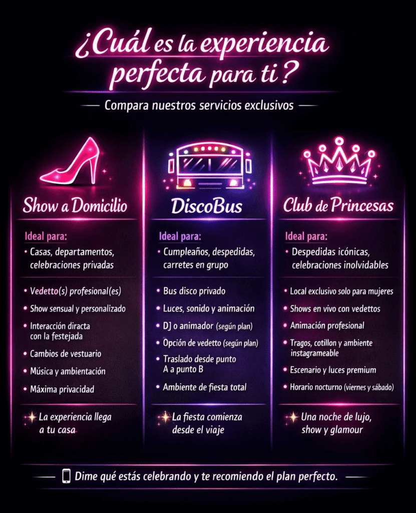 Más de 3 años siendo líderes en despedidas de soltera. Ubicación exclusiva en Santiago, Show de Vedettos, cotillón, barra lista para tus pedidos y mucho más.